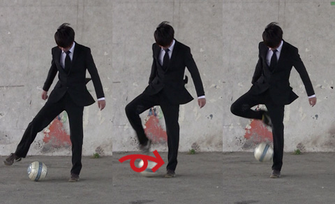 ボールをすくい上げると同時に、爪先がボールに触れる直前にストールしているボールをすくい上げる足側に転がしましょう。