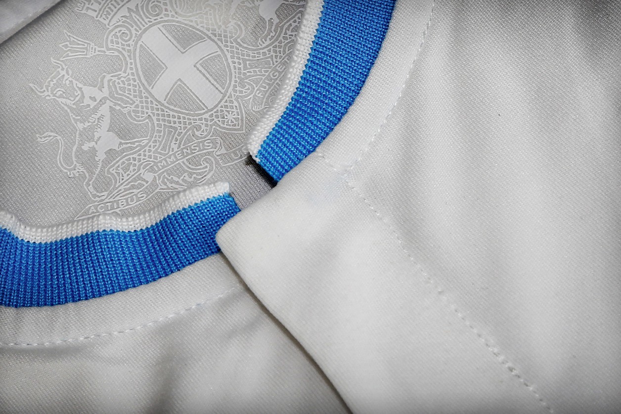 2014-15ホームでは江戸っ子のようにさりげなく外側にプリントされていたマルセイユの紋章だが、ニューモデルは再び内側へ。