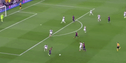 あえて強引に“中"に仕掛けていくことで、相手守備陣を中央へ収縮させたネイマールの突破。中央への意識づけ・警戒をさせることで、今度は外が空いてくる。ここでも大外の選手が1人完全フリーになっており、そこへ通れば1点もの。そういった意味でも効果と意義のあるドリブルといえる。