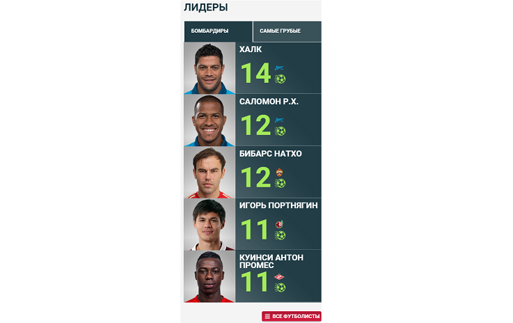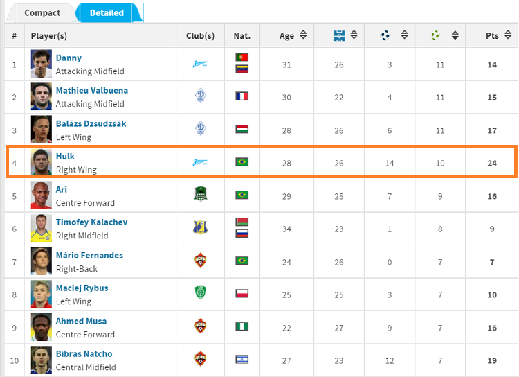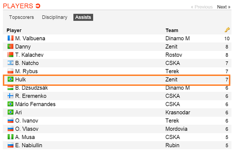 ロシア・プレミアリーグの公式サイトにアシスト数が掲載されていなかったので、ここでは『Soccerway』のデータを参照する。