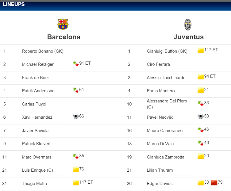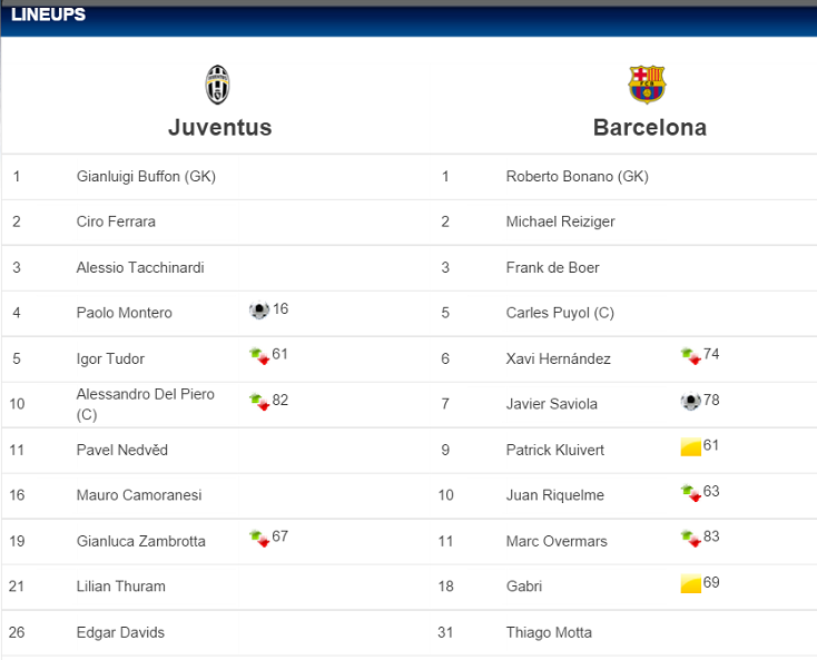 この時先発した選手の中で現在もチームに在籍しているのはユヴェントスではジャンルイージ・ブッフォン、バルセロナではチャビ・エルナンデスとそれぞれ1選手ずつであるが、2ndレグで先発したルイス・エンリケは現在バルセロナの監督を務めている。