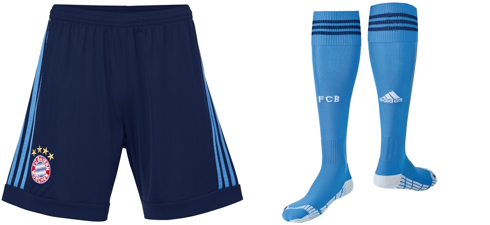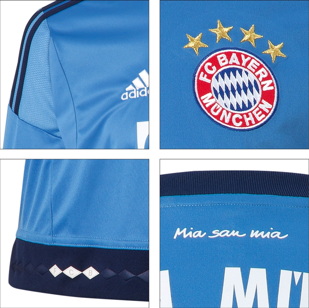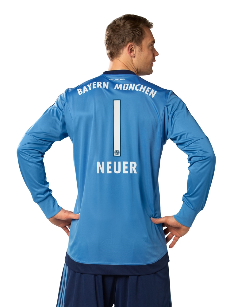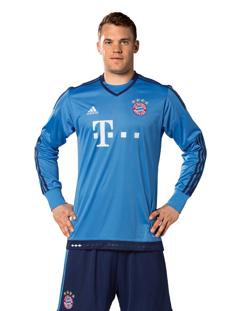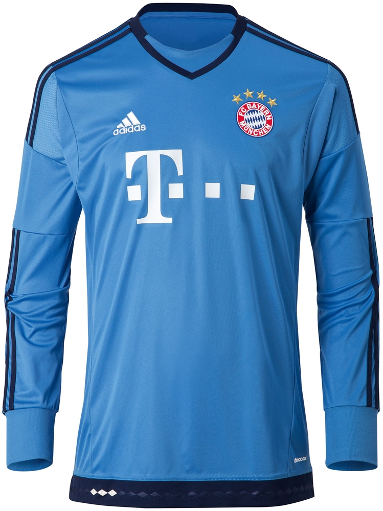 バイエルンは先週、2015-16シーズンの新ユニフォームを発表したが、その際にお伝えしそびれたGKのニューモデルがこちら。FP用が赤と青のストライプから赤一色に戻ったこともあり、2015-16モデルでは水色を基調に紺との組み合わせを採用した。