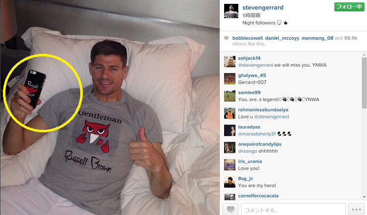 こちらはベッドに横たわるジェラードである。なんともフカフカそうなクッションにもたれかかり、「フォロワーのみんな、おやすみ」とメッセージを送っている。