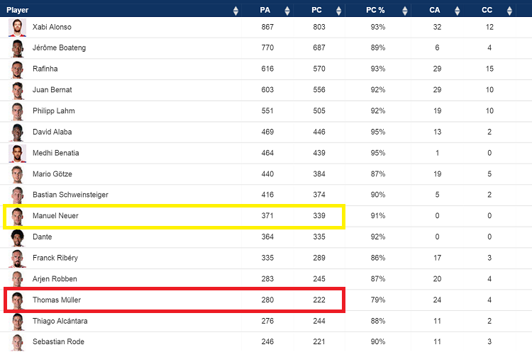 左の行から順にパス数、パス成功数、パス成功率、クロス数、クロス成功数。注目してほしいのは黄色く囲った部分と赤く囲った部分なのだが、GKマヌエル・ノイアーのパス数はトーマス・ミュラーのそれを上回っているのだ!