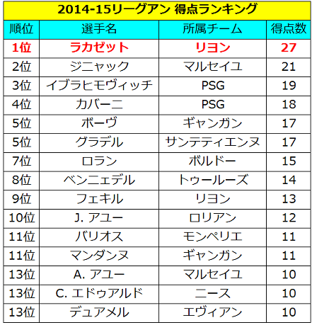 以前お伝えした通り、欧州5大リーグで「20得点」の大台に乗せたのは13人だった。