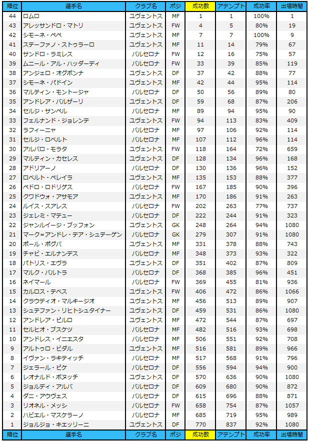 ユヴェントス、バルセロナの選手が今季CLで記録したパス成功率をランキングにしてみた。