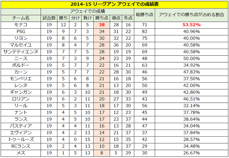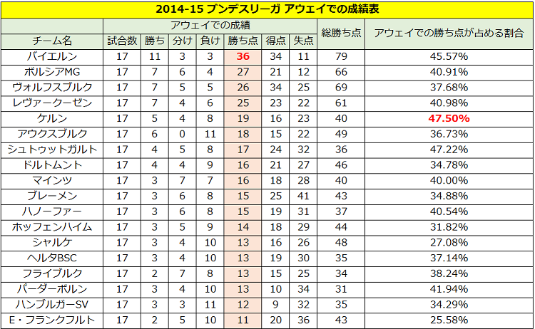 なお、興味深いことにブンデスリーガでは全チーム18チームのパーセンテージが50%を下回った。やはりドイツはホームアドバンテージを得やすいのだろうか。