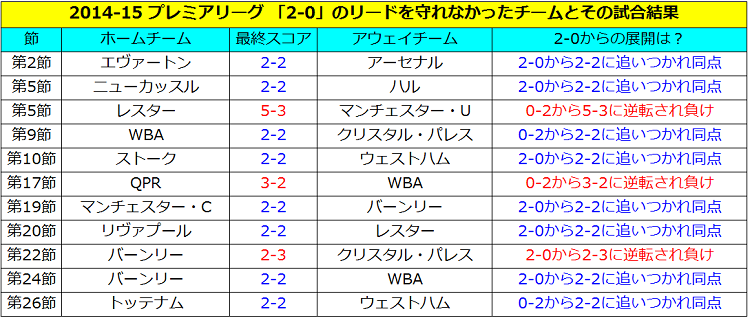 こちらが、2014-15シーズンのプレミアリーグにおいて「2-0」というスコアから追いつかれた、あるいは逆転された試合をまとめたものである。