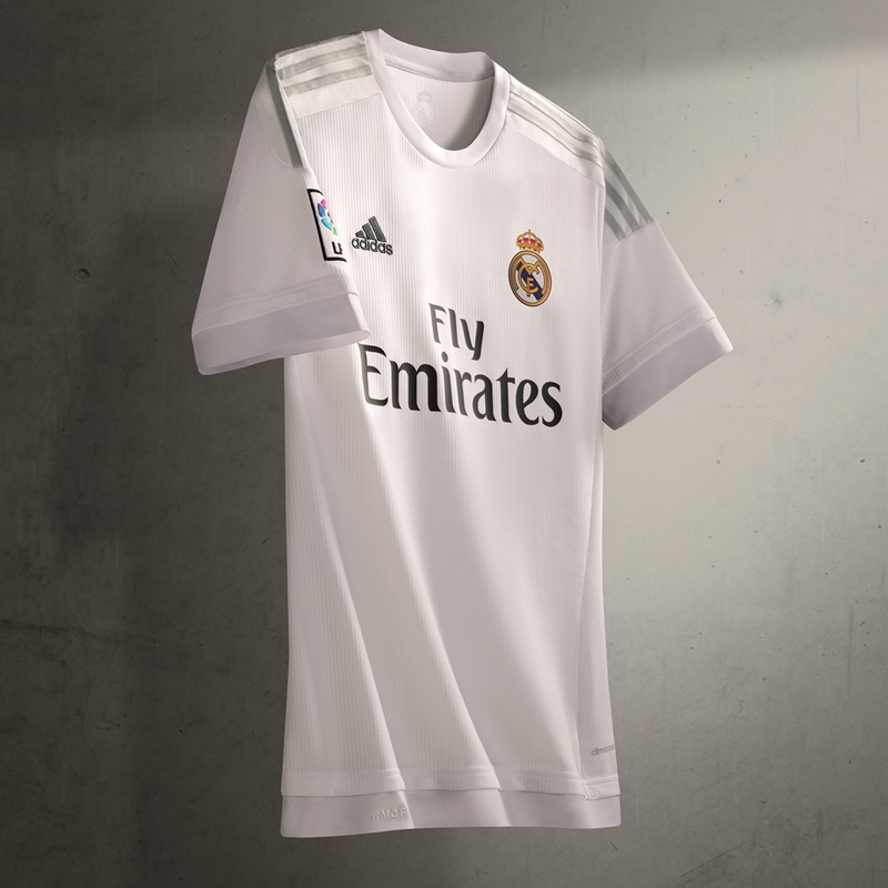 レアル・マドリーの2015-16ホームは肩のスリーストライプスにシルバーグレーを配するなど、白を強調したデザイン。