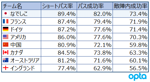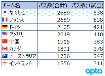 今大会のなでしこジャパンも2689本(1試合あたり538本)のパスを記録しているが、これはフランスと並びトップの値だ。