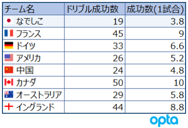 この点についてはなでしこジャパンにも当てはまるようだ。ドリブル成功数19回はベスト8進出チームでは最も少ない値。また、1試合あたり3.8回というのも下から4番目の数字だ。