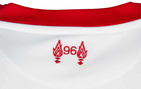 背面の首元にはホーム、サード同様、1989年に起こった「ヒルズボロの悲劇」の犠牲者96名を追悼するシンボルが入れられている(左右の炎は「ヒルズボロの悲劇」と「ヘイゼルの悲劇」を追悼する意)。