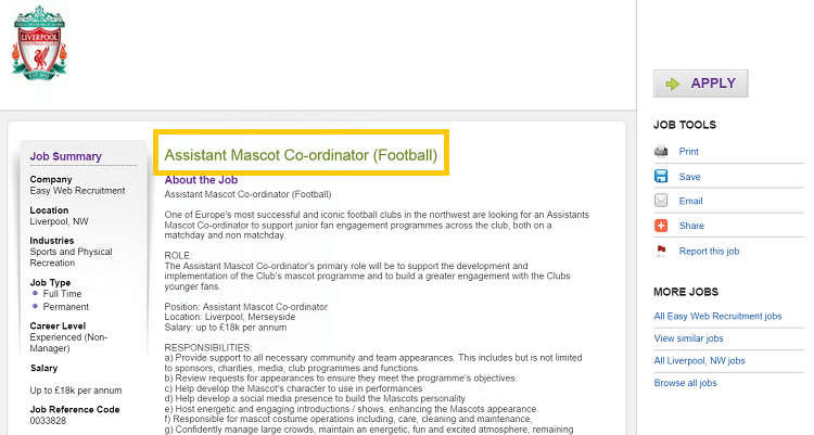 トップにはリヴァプールのエンブレム、見出しには"Assistant Mascot Co-ordinator (Football)"とある。