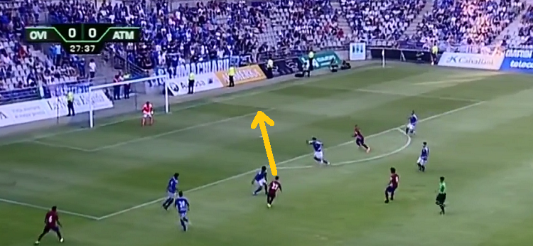 ビエットとグリーズマンに対して、オビエドの選手はそれぞれ1人ずつついている。選手と選手の距離、いわゆる「門」も狭い。
