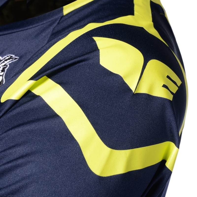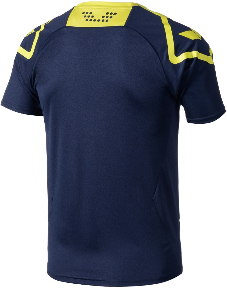紺を基調にアクセントで取り入れられた黄色が映えるデザインとなっている。特に肩の部分が印象的だ。
