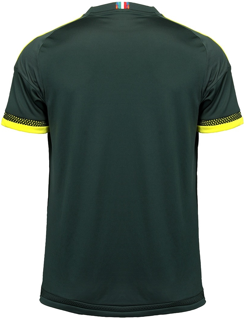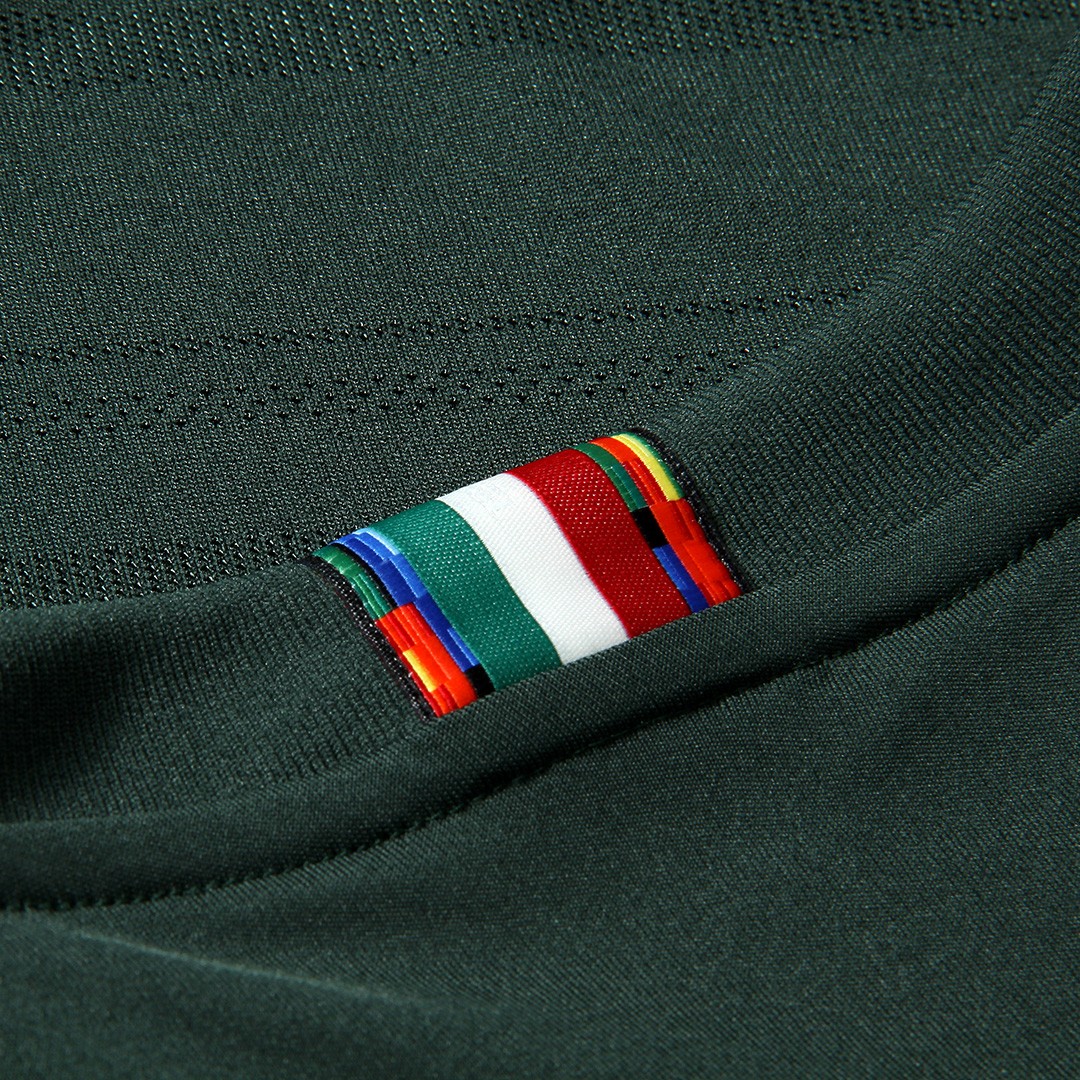 深い緑を基調にアクセントとして黄色を配し、シャツの背面にあるタグには万博を象徴するカラーが用いられている。