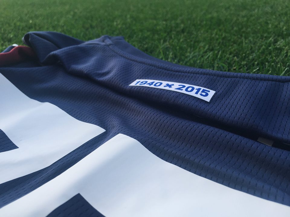 背面の首元にはクラブ創設75周年を迎えたことを表す「1940×2015」の文字。青一色の背番号部分は下部が山型の切り替えしになっているところが面白い。