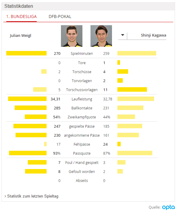 ちなみに上位の顔ぶれを見るとルイス・グスタヴォ(ヴォルフスブルク)が91%、イルカイ・ギュンドアン(ドルトムント)が90%、ブンデスリーガのMF平均をとると73%である。『sport1』は「パスマシーン」とヴァイグルを紹介したが、まさしくその通りである。(画像は香川との比較、『kicker』による。)
