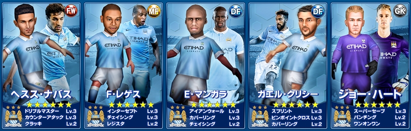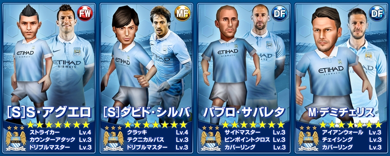 第1弾で登場するのは、レアリティ★7が「[S]S・アグエロ」「[S]ダビド・シルバ」「パブロ・サバレタ」「M・デミチェリス」、同★6が「ヘスス・ナバス」「F・レゲス」(※フェルナンド)「E・マンガラ」「ガエル・クリシー」「ジョー・ハート」という計9選手。