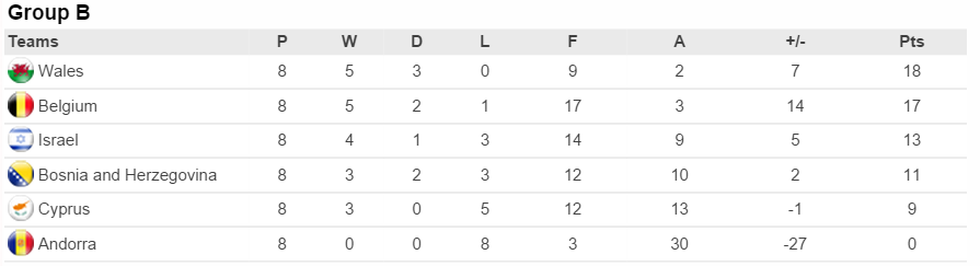 次節のキプロス戦に敗れれば、2位以上での通過の可能性が消滅。また、ウェールズとキプロスが次節ともに勝利しても、イスラエルの2位以上での通過の可能性は消滅。
