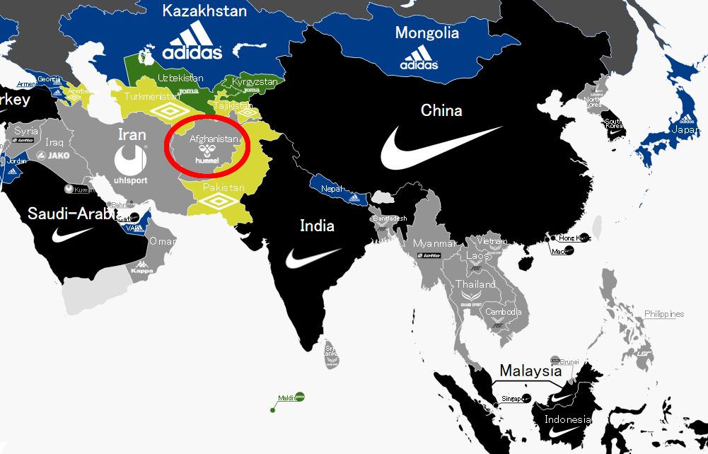 薄いグレーとなっている国々はLottoやKappa、Hummelにuhlsportといったブランドがユニフォームを提供しているチームだ。