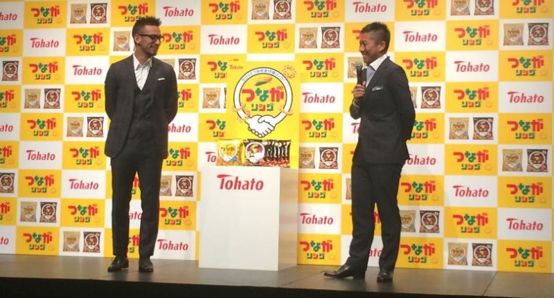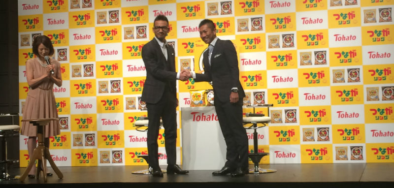 東ハトのCBO(チーフ・ブランディング・オフィサー)でもある中田英寿、前園真聖のアタランタ五輪日本代表コンビが商品を発表、なでしこジャパンの有吉佐織、岩清水梓もVTRに出演し、商品だけでなく人のつながりについてPRした。