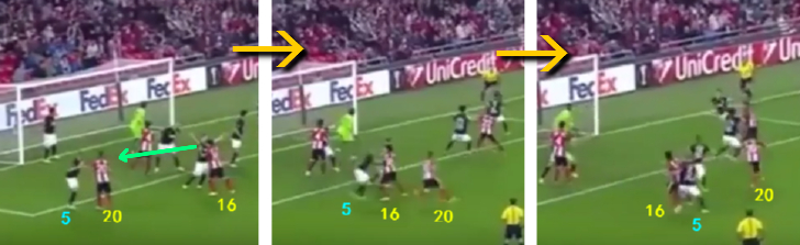 相手DFラグナル・クラヴァン(5番)のマークもやや甘かったが、よくみるとビルバオDFシャビエル・エチェイタ(16番)が彼をスクリーンしているのが分かる。
