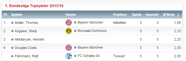 『Kicker』でも、香川は5試合終了時点で全体2位という高評価であった。なお、1位のミュラーはダームシュタット戦のみ68分からの途中出場であったが、ここまですでに6ゴールを叩き出している。