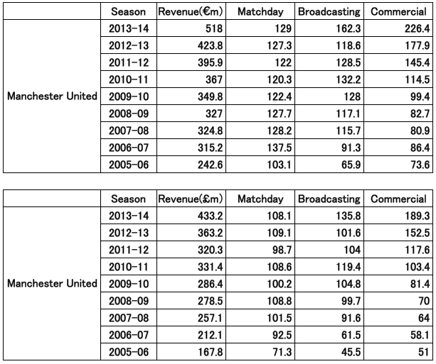 大変見難いとは思いますが、下記がユーロとポンドにおける近年のユナイテッドの収入内訳になります。(それぞれレートは当時のもの)(執筆中に14−15シーズンの数字が出ましたがそれは割愛しています)