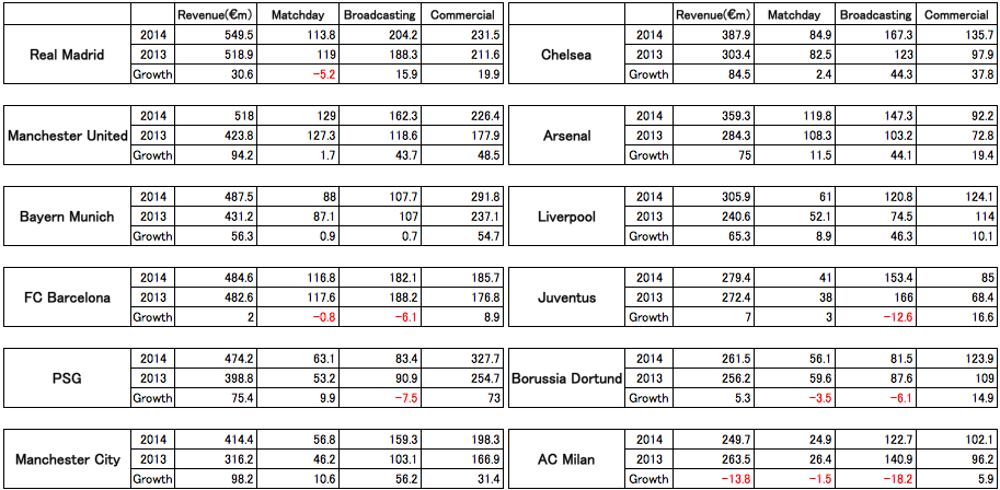 13−14シーズンの総収入は518mユーロ(433.2mポンド≒788億円)、ランキングでは07−08シーズン以来の2位となりました。05−06シーズンが242.6mユーロ(現レートで326.5億円)でしたので10年もしない間に収入は倍に以上になっています。