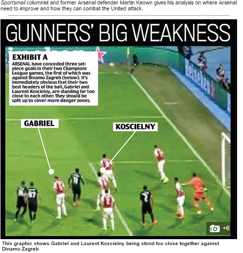 「今季ここまで、アーセナルはセットプレーの守備時に混乱している。火曜日のオリンピアコス戦ではコーナーから2失点した。1失点目では、メスト・エジルがボックス際できちんと自分の仕事をしていなかったように見えた。2失点目の際には、ダビド・オスピナの前に相手FWが立つことを、なぜ誰も妨げようとしなかったのか全く分からない」