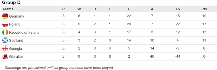 首位のドイツが盤石であることを考えると、グループDの最大の見どころは2位ポーランド対3位アイルランドの2位争いになるだろうか。