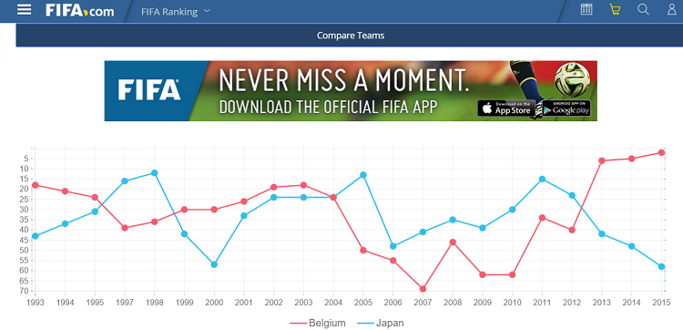 以降ベルギーは50位以上をキープし続けてきたのだが、2004年以降に低迷期を迎え、2007年6月には過去最低となる71位を記録。その後も2009年から2010年にかけて68位を2度記録したのだが(2009年10月と2010年3月)、仮に1位になればそこからわずか5年半で66ランクもアップしたことになる。