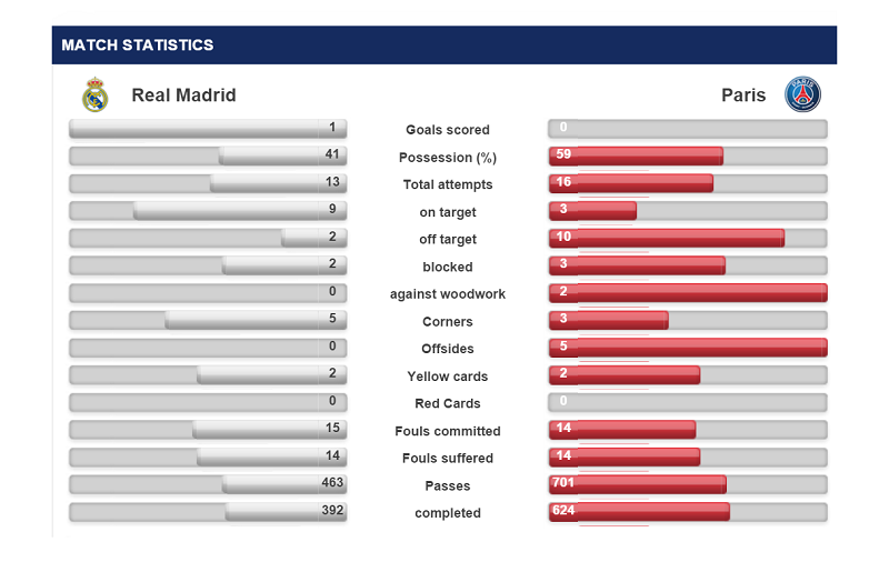 ゴール数(Goals scored)や枠内シュート数(on target)こそマドリーが上回っているが、ボール支配率(Possession)はPSGが59%とリードしている。