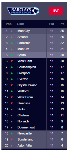11節までを終了したイングランド・プレミアリーグ。現在の順位はこのようになっている。