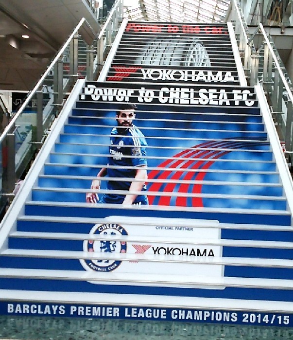 横浜ゴムでは以前のモーターショーから全ての階段をジャックして自社の広告に使っていたそうですが、今回はここにチェルシーの各選手を使いました。