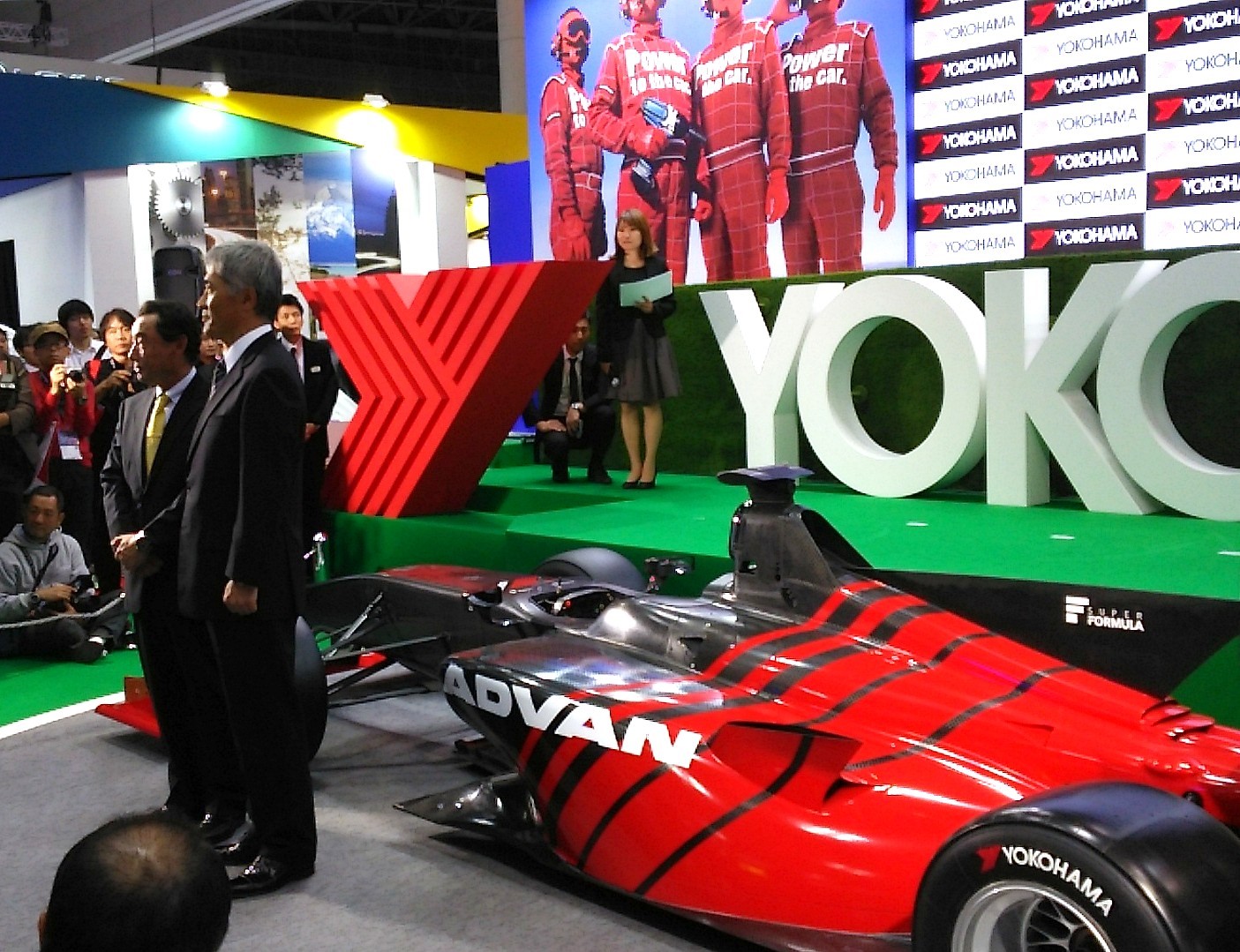 2日目、いよいよ横浜ゴムのプレスカンファレンスになりました。ブースには100人を超える報道陣が集まり、スチールカメラのフラッシュが途切れません。