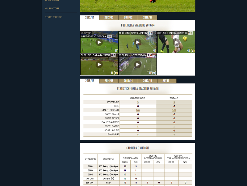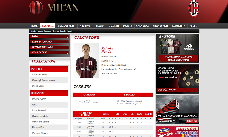 下部にはゴール動画、出場歴などが見れミランを現代風にブラッシュアップした印象を受ける。