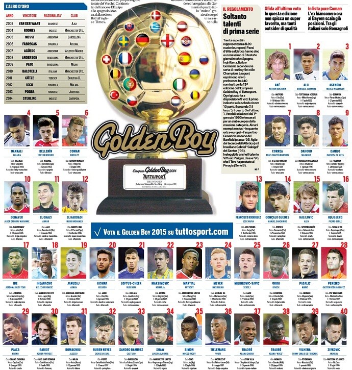 イタリアの『Tuttosport』が毎年発表する「ゴールデンボーイ賞」の2015年度ノミネート選手40人が発表になったようだ。海外各メディアが伝えている。