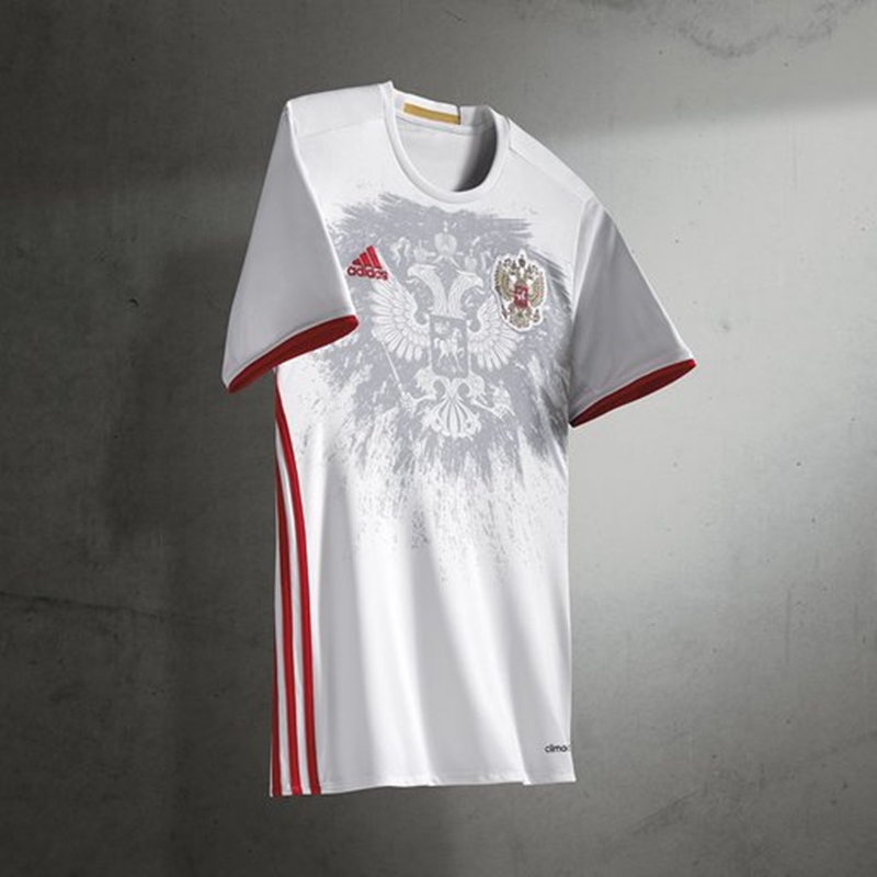ホームに続いて発表されたロシアの新アウェイユニフォームは、引き続き白を基調にしたデザイン。ロシアのシンボルでエンブレムにも用いられている「双頭の鷲」を透かしでシャツの中央に配している。
