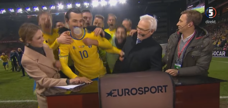 そんなイブラヒモヴィッチは試合後、ピッチ脇に設けられた特設ブースで現地テレビ局の中継に出演。本戦出場を決めた喜びを語っていたのだが、その最中に素敵なサプライズがあった。