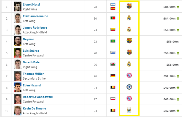 ちなみに、同サイト内で市場価値が最も高い10選手はこちらの顔ぶれ。なんと1位から6位までがマドリー、あるいはバルセロナの選手である。