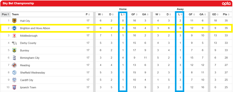 この通りブライトンは2位であるのだが、L(負け数)の列にご注目。