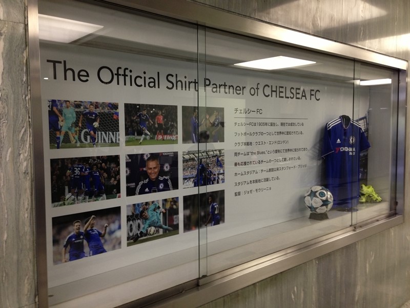 ≪本社エントランスにはチェルシーとのスポンサーを示す展示≫