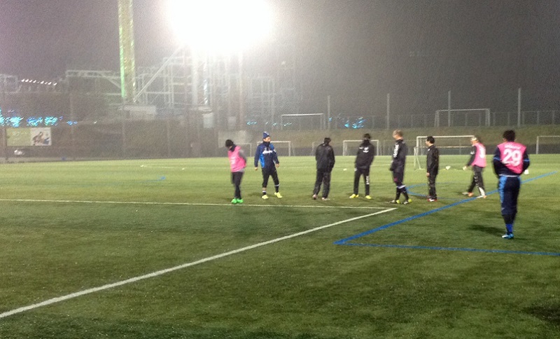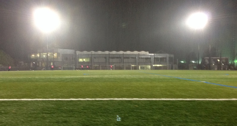 当日はあいにくの雨模様(そのために写真が大変なことになっていますがご了承願えれば…)。加えて夜の開催ということもあり、気温も10度を下回る厳しい環境。そんな悪天候にもかかわらず、集合場所のヴェルデイグラウンドに到着したころには、すでに10人近い参加者たちがピッチで白い息を吐きながら熱心にアップしていた。