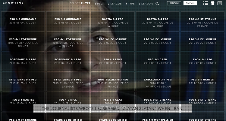 これまでにイブラヒモヴィッチがPSGでゴールをあげた試合の全ゴールの情報が掲載されており、その試合名をクリックするとそのゴール動画が再生されるという仕組みだ。