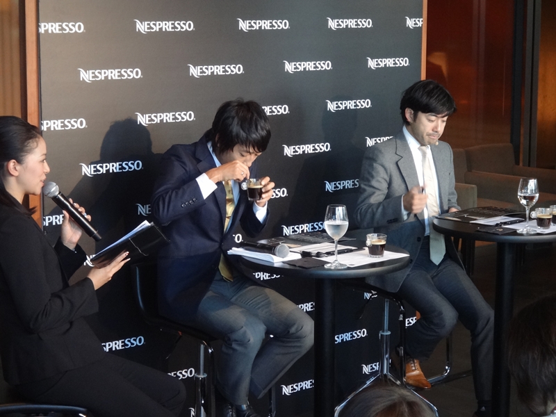 普段から毎日朝・昼、時には夜もコーヒーを飲むという中村。ただ、この日はテイスティングということで、ネスプレッソ公認アンバサダーで“ソムリエ”の大越基裕さんのアドバイスを受けつつ、「人生で一番集中しながら」コーヒーをテイスティング。2種類のテストで見事一つを当ててみせた(右の大越さんはもちろん両方正解!)。