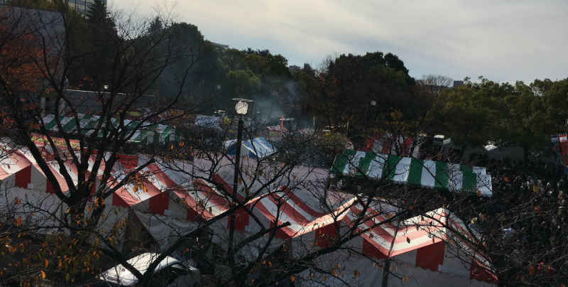 スペインフェスティバルとは、ステージ、40の飲食店・物販ブースなどからなる。日本にいながらスペインを楽しみ感じられる2日間となっており、今年は11/29、11/30に開催された。昨年度は雨模様だったようだがそれでも11万人を動員、今年は天候に恵まれたためより多くの人手で賑わった。