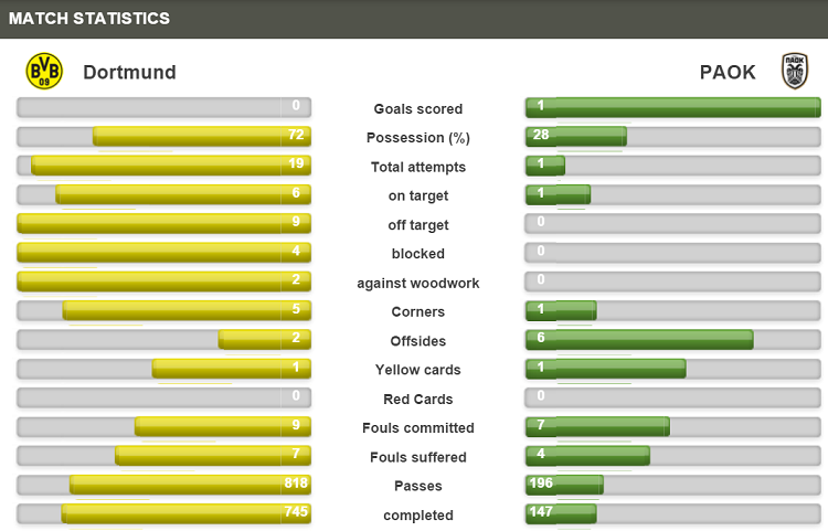 こちらは、試合後UEFA.comに掲載されたスタッツだ。左がドルトムント、右がPAOKのデータだが、見事に対照的な数値になっている。