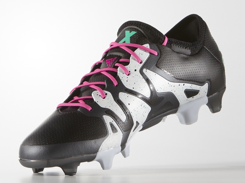 決定的なプレーで流れを変える、ゲームチェンジャー向けの『エックス 15.1』。新色はコアブラック×ショックミント×ランニングホワイトで、バイブラントピンクのシューレースがいいアクセントになっている。